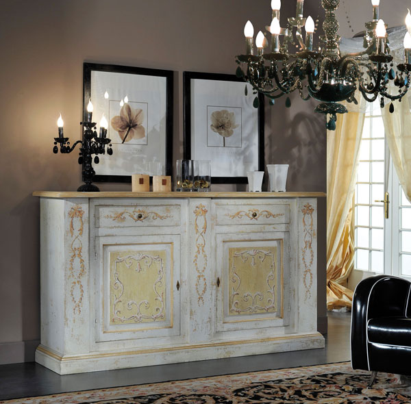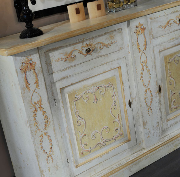 Credenza laccata e decorata bianca gialla 2 porte e 2 cassetti