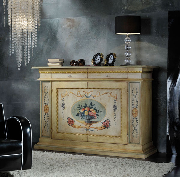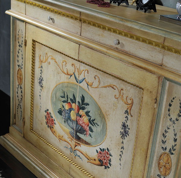 Credenza laccata e decorata cesto frutta 2 porte e 2 cassetti