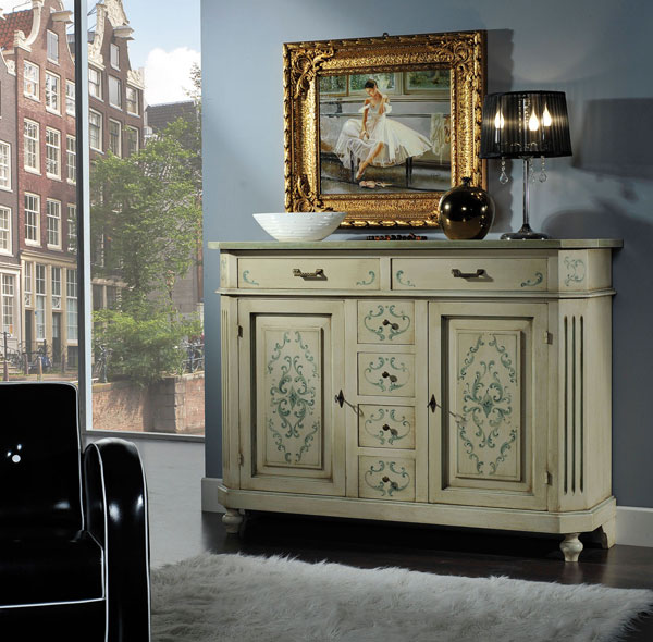Credenza scantonata laccata verde e decorata 2 porte e 6 cassetti