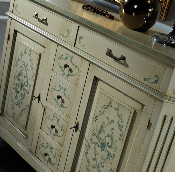 Credenza scantonata laccata verde e decorata 2 porte e 6 cassetti